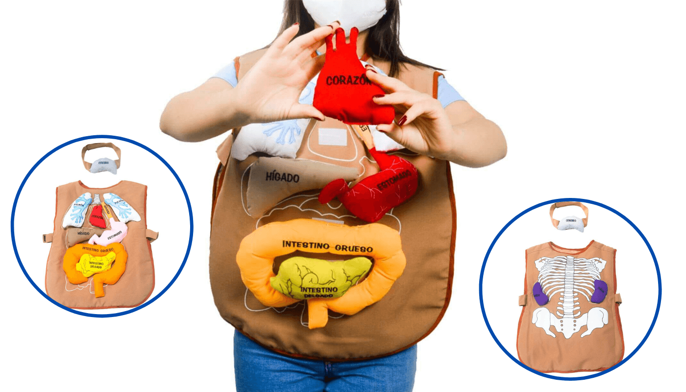 A partir de los 2 años, en la que el juego simbólico se hace presente, también podemos optar por materiales como las maquetas o mandiles que muestran al niño los órganos internos del cuerpo y les permite manipularlos, así como ubicarlos en el lugar del cuerpo que les corresponde.